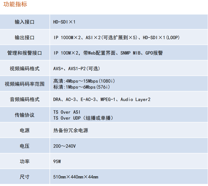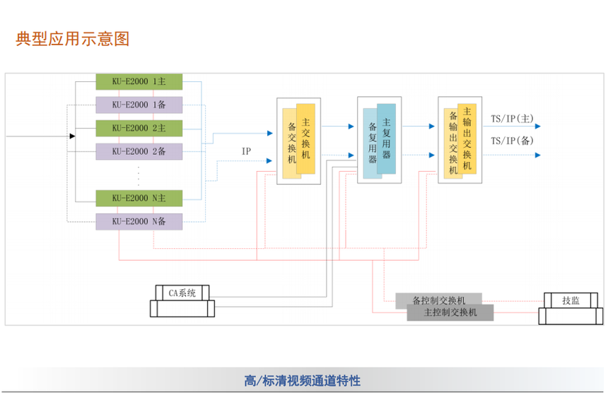 KU-E2000/HD高清专业码器是北京东华广信/广州柯维新推出的一款基于AVS+广电行标的广播级 嵌入式高清数字编码器。 KU-E2000/HD高清专业编码器支持H.264/AVC、MPEG-2 等标准的扩展视频编码选项,支持各种主 流音频编码格式的输岀,能方便地和各种网管系统通过SNMP进行集成 技术优势 KU-E2000/HD高清专业编码器采用完全定制的嵌入式编码平台,拥有世界顶级的运算能力,使 用了世界先进的Dual-Pass模式判断和码率控制技术,无论是AVS+还是H264/AVS都能输出世界顶级 的视频编码质量。 KU-E2000/HD同时支持两路独立音频码流的输出,并且支持使用Dolby-E音频输入,或者使用符 合 SMPTE-337M规范的DD/DD+透传方式输入音频。通过精密的校准,该编码器在编解码延时,音视 频同步的控制上具有比同类产品更优的指标。 KU-E2000/HD高清专业编码器的视音频特性经广电总局计量检测中心检测,完全符合规范并且指 标优秀。 典型应用 支持AVS+标准的KU-E2000/HD高清专业编码器自2013年推出后、产品以高质量高稳定性成为支 持AVS+标准产业化应用的主流产品。至2020年止,被包括中央广播电视总台在内的全国数十家电 视台选用,用于超过80套节目的AVS+标准的高清节目上星传输覆盖,成为细分市场冠军,覆盖率 超过90%。