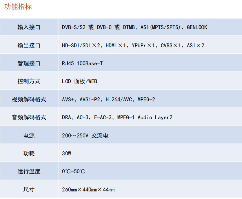 KU-D2000是北京东华广信/广州柯维新推出的集卫星接收和TS流解码功 能于一体的全球首款支持AVS+标准的广播级高/标清数字电视专业接收/解 码器。 KU-D2000采用专用解码芯片,全面支持AVS+/AVS1-P2/H.264/MPEG-2标 准的解码,音视频各项指标符合广播级技术规范,给用户带来高品质的视 音频还原效果。 KU-D2000具有双 PCMCIA CI插槽,可解密多个加密节目。 KU-D2000支持DVB-S/S2或DVB-C或DTMB信号解调,通过解扰处理后,可 输岀TS清流,供进一步处理使用。 KU-D2000提供了ASI输入接口,支持对经ASI输入的TS流的解码。 KU-D2000提供了种类齐全的输出接口,如HD/SD-SDI、HDMI、ASI、 TS/IP、 YPbPr、CVBS和XLR音频输出。 KU-D2000不仅具有通过LCD面板进行控制的功能,同时还提供了通过WEB 进行配置控制的功能,简单的操作和友好的界面,可帮助用户对设备进行 配置。